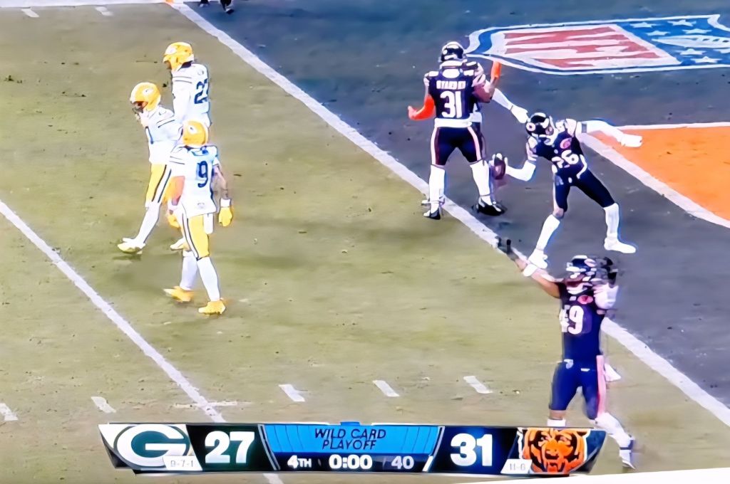 We watch the Packers miss a field goal with less than 3 minutes left, watch the bears get a TD with less than 2 minutes left. Now the Bears are ahead 31 to 27. They hold the Packers and ultimately break up their pass in the end zone to seal the win!