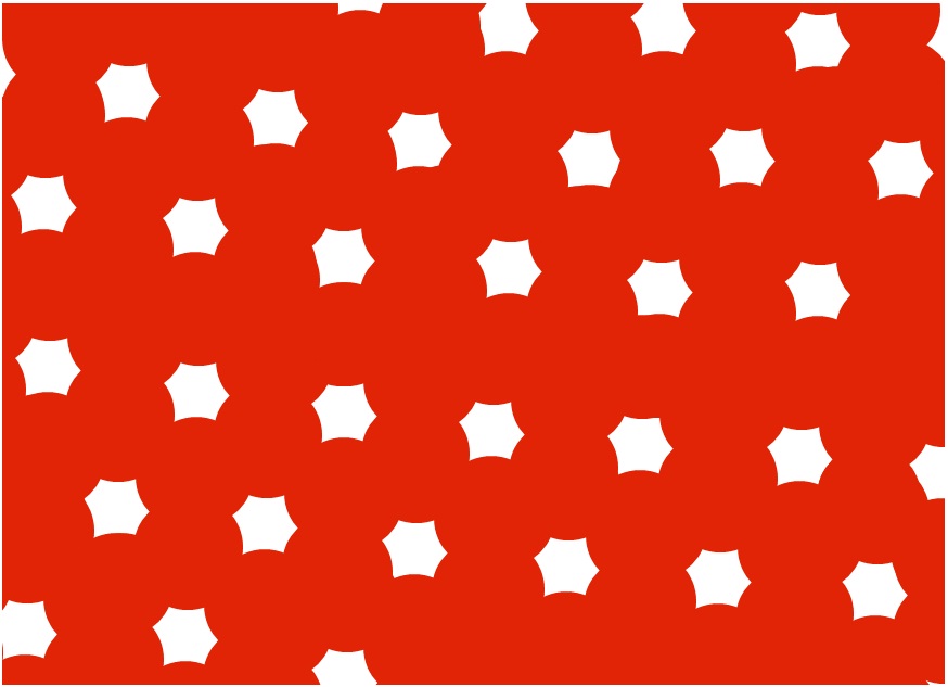 I looked up-close and the haystack vanished. Genius appeared. A yellow background behind red circles evenly spaced and sized. And repeating white shapes that are not dots, but six-pointed starbursts.
