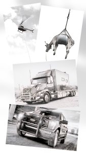 The rig’s chrome exhaust stack was almost close enough to touch. I was in my seat pulling the rope through my glove and making a loop. Next I was outside my door, using the running board and external grab handle to steady myself. Below, yellow lines flashed by. With my wrist I started twirling the rope loop…then I let it fly. On that first try I lassoed the stack and swung over between the cab and the trailer.